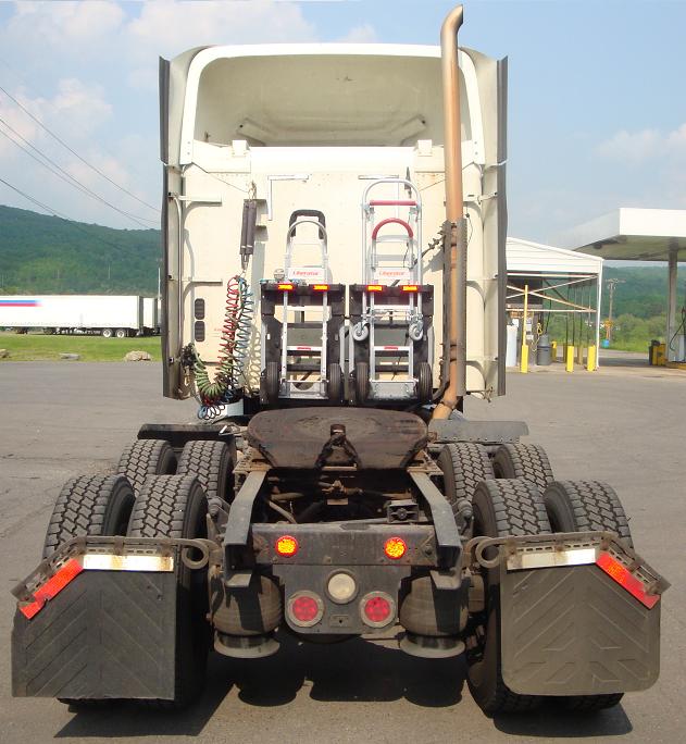 The HTS-30DTF Ultra-Rack allows food service fleets to transport hand trucks quickly and safely behind the semi-tractor chassis. B&P Liberator hand trucks locked safely aboard tractor frame.