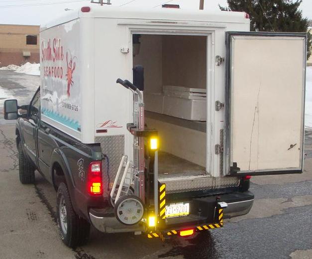 Images courtesy of South Side Seafood & Piece of Cake Frozen Specialties. HTS-20SF350 Hitch Swing Mount Ultra-Rack. B&P Liberator commercial hand truck locked safely aboard Ford F350. HTS-20SF350 tow hitch receiver swing mount is designed for the rear of commercial pickup trucks using refrigerated truck bodies. Designed for the rear of refrigerated food service delivery vehicles, this new HTS application saves cargo temperature, route time, valuable cargo space, prevents worker injuries, product damage and bacterial cross-contamination. The new HTS-20SF350 unit reduces reefer recovery run time, physical effort, thereby saving thousands in fuel and labor costs annually! The HTS Ultra-Rack saves a route driver a minute or more per delivery stop, that's about 2.5 hours per week! For one delivery vehicle over a 4 year time period = $4,800 dollars in labor + $400 in fuel savings + $300 in hand truck replacements = $5,500 dollars! It's simple; save a minute per stop X 30 stops per day = 600 mins. per month or 120 hours per year X $10 per hour = $1,200 dollars in annual savings! Include additional payload cargo area, less freight claims damage, less driver injuries, reduced DOT fines, reduced liability and insurance costs = $2,000 every 4 years! Add it up, $5,500 dollars + $2,000 = $7,500 dollars per delivery vehicle over a 4 year time period! Save approximately $1,875 dollars every year, per delivery vehicle! Prevent a workmen's compensation injury claim or an expensive liability lawsuit and well... you get the point! Industry Overview Summary: Workmen's Compensation ▪ Ergonomics ▪ Cross-contamination ▪ Corporate Liability ▪ Insurance Costs ▪ Risk Management The average cost for an MRI scan is $1,500 dollars, the average Workmen's Compensation claim is $15,000 dollars and the average legal liability lawsuit settlement for businesses is $150,000 dollars! The HTS completely revolutionizes route safety and worker productivity, while reducing corporate risk! Reducing physical climbing, lifting and lowering can reduce back injuries, tripping and falls; thereby decreasing risk, worker injuries and insurance costs! Any driver who rushes back (off-route) in a hurry to retrieve their forgotten hand truck is no longer a safe driver, they instantly become a liability! Unsanitary and deplorable events often occur in alleys, service entrances and parking lots of night clubs and restaurants in the early morning hours. Hand trucks travel across filthy sidewalks, through mud puddles, near leaking dumpsters, public rest rooms, dirty coolers and oily loading dock areas. Manually lifting hand trucks aboard food service delivery vehicles increases the likelihood of transferring hazardous ground source bacteria from tires, onto work uniforms and hands, onto food cartons. This cross-contamination increases the possibility of salmonella, E. coli and Listeria bacteria illness! Cross-contamination of bacteria, chemicals and dirt onto food products and sanitary medical supplies can be reduced when transporting hand trucks out and away from products. Hand trucks often transfer contaminates into food refrigeration vehicles or track out chemicals or spread disease from hazardous shipments. The HTS reduces hand truck tires and load plate surfaces from retransferring contaminates to customer locations and products. Reduce fuel consumption for refrigeration-freezer units by retaining temperature in food service trucks; reduce total entries and open-door time! Prevent warm hand trucks from acting as a heating element, prevent temperature loss, thermostat activation, saving reefer fuel in warmer climates! HOLD THE COLD! FUEL SAVINGS $$$ WHEN NOT TRANSPORTING A HAND TRUCK WITHIN REFRIGERATED TRUCK BODIES It’s nearly impossible to control the length of time or the number of times a refrigeration cargo door is opened during a delivery stop. Many refrigerated truck bodies have shut-off switches that prevent the reefer unit from running while the cargo door remains open. This option can save energy and can lower fuel costs; however it does not prevent expensive temperature loss. Often the final return trip back to the truck can be the most important when trying to retain cargo temperature! After the driver gets his delivery checked in, rotates and stocks their customer order, signs bill and receives payment. This time can average 10-15 minutes; ample time for most thermostat controls to recover their safe operating temperature and properly shut down. The driver then exits the building and must reload their hand truck aboard the vehicle. Opening the freezer door pulls the cold air outward and closing the door pushes the warmer air inward. This action results in major internal temperature loss! Refrigeration companies informed us that if the ambient temperature is 75-80° degrees or above, this would cause the reefer system thermostat to recover for approximately 5-8 minutes. Eliminating a 5-8 minute cycle time X 20 stops per day can save a minimum of 100 minutes of reefer time per day. Refrigeration manufacturers informed us that most refrigerated systems use a gallon of diesel fuel per hour. Preventing a fuel loss of 1.5 gallons per day X $4.25 per gallon can generate a savings of $6 dollars per day, $30 dollars per week or $120 per month, per delivery vehicle! Access and navigate the narrow aisle of freezers much safer, faster and easier when grabbing small orders. Save time, no moving or climbing over hand truck. Refrigerated truck body manufacturers using thermo cameras have discovered that metal hand trucks heat up quickly in warm weather and act as a heating element, triggering thermostat controls! What other investment could you possibly make in your company and truck fleet that will give you that large of a return and that type of protection? The Hand Truck Sentry is a hand truck safety rack, hand cart carrier, dolly cart rack or hand truck lock rack; whatever you call it, it's so much more!! The Hand Truck Sentr